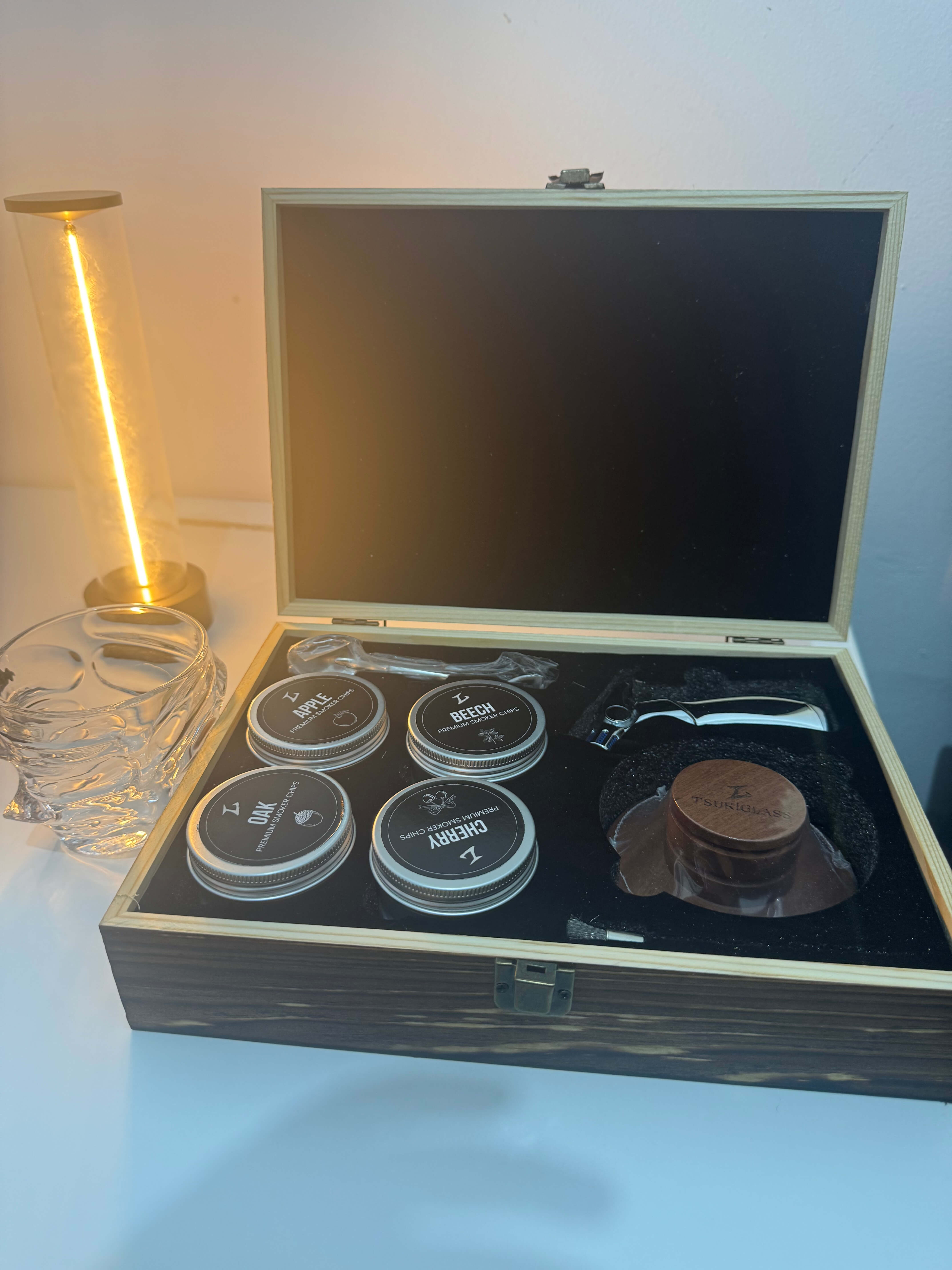 8 Premium Falvor Wood Chips – Oak, Cherry, Beech, Apple stored in a sleek metal case enough for 200+ drinks.