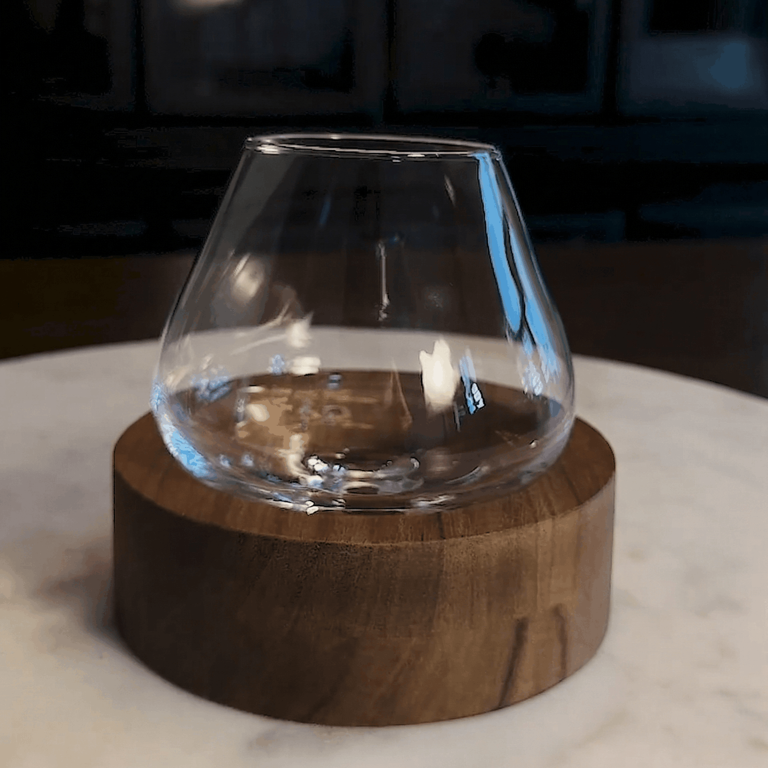 Yes! Every KAMI glass includes a premium, 100% real wood coaster at no extra cost. It’s a 3-in-1 system: use the recessed side as a secure stand, flip it over to engage the kinetic spinning base, or remove it entirely to spin the glass safely on your table.