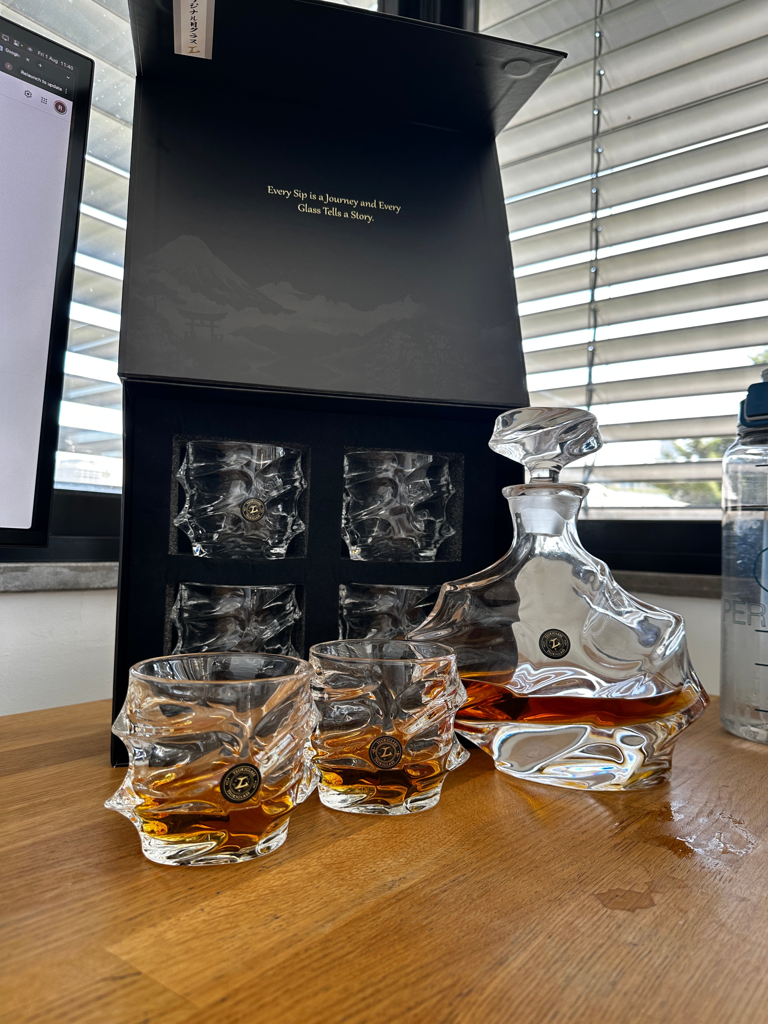 The TsukiGlass Decanter is packaged individually in its own luxury box, while the TsukiGlass set of four glasses comes in a separate luxury box. Both are part of our limited-edition packaging collection, designed to be gift-ready and elegant.